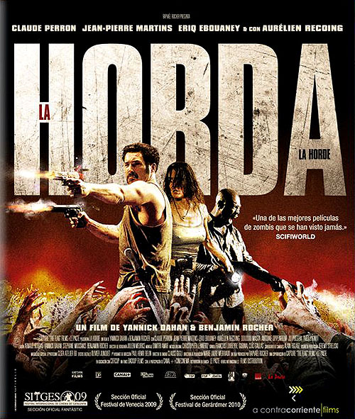 El que vea La horda sin conocer su supuesta adscripción a la etiqueta nuevo cine de terror francés desde luego pensará más bien en una película francesa que intenta aproximarse al modelo americano, desde la ambientación en los barrios marginales con ese edificio monolítico que domina este submundo hasta el intento de subirse al carro de las historias de zombis de moda, pasando por el estilo tarantiniano de los personajes (o del giro argumental supuestamente sorprendente)y de los tiroteos. ¿Donde queda pues el nuevo cine francés en esta película? Supongo que en un cierto carácter nihilista y en algunos detalles particulares (los personajes angoleños por ejemplo), muy poca cosa para hablar de un nuevo cine francés que, si por este film fuera, parecería haberse diluido como un azucarillo en las amplias aguas del cine americano (ni siquiera hay demasiado gore).